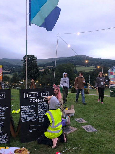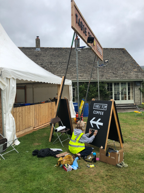 At the Greenman Festival, I was commissioned by Table Top Coffee to revitalize the visibility and style of their premises, starting with a thorough revamp of their directional signs. This extended to hand painting the coffee shop’s logos on two double-sided A-boards and fabricating 'order here' signs, imparting a unique and eye-catching touch to the user navigation process. Lastly, the menus were re-written in the iconic Greenman font, lending a cohesive and quintessential charm to the brand at the festival.